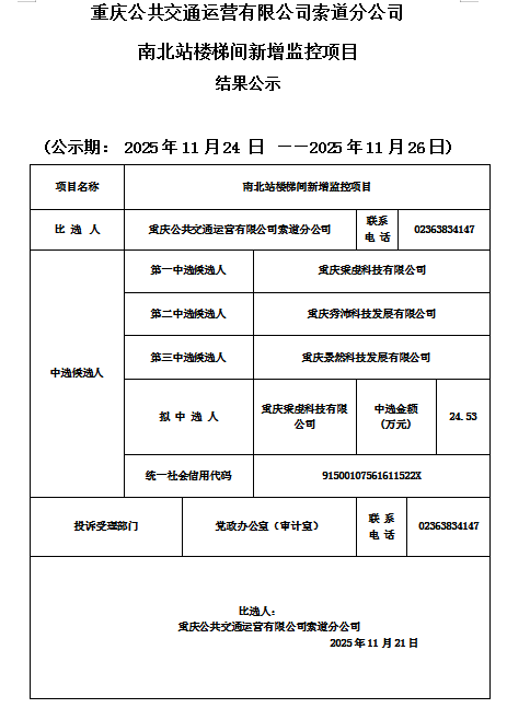 重庆公共交通运营有限公司索道分公司南北站楼梯间新增监控项目结果公示