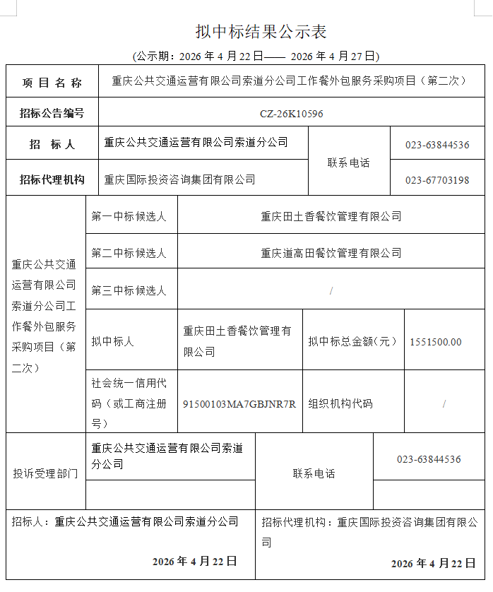 重庆公共交通运营有限公司索道分公司工作餐外包服务采购项目(第二次)拟中标结果公示