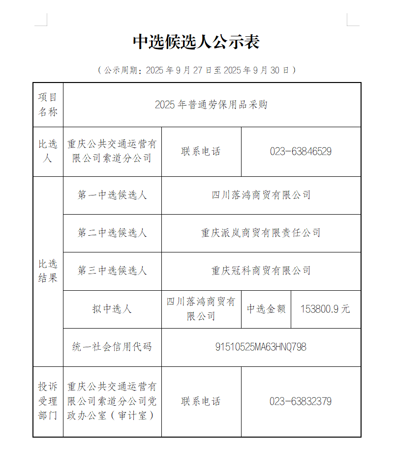 2025年索道分公司普通劳保用品采购竞争性比选中选候选人公示