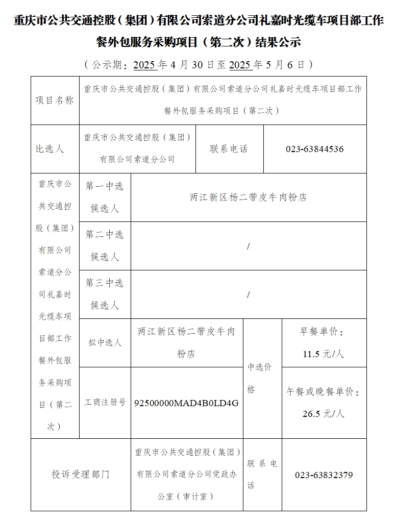 重庆市公共交通控股(集团)有限公司索道分公司礼嘉时光缆车项目部工作餐外包服务采购项目(第二次)结果公示