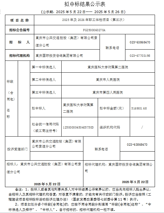 2025年及2026年职工体检项目(第三次)拟中标结果公示表