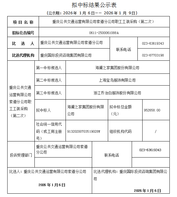 重庆公共交通运营有限公司索道分公司职工工装采购(第二次)拟中标结果公示